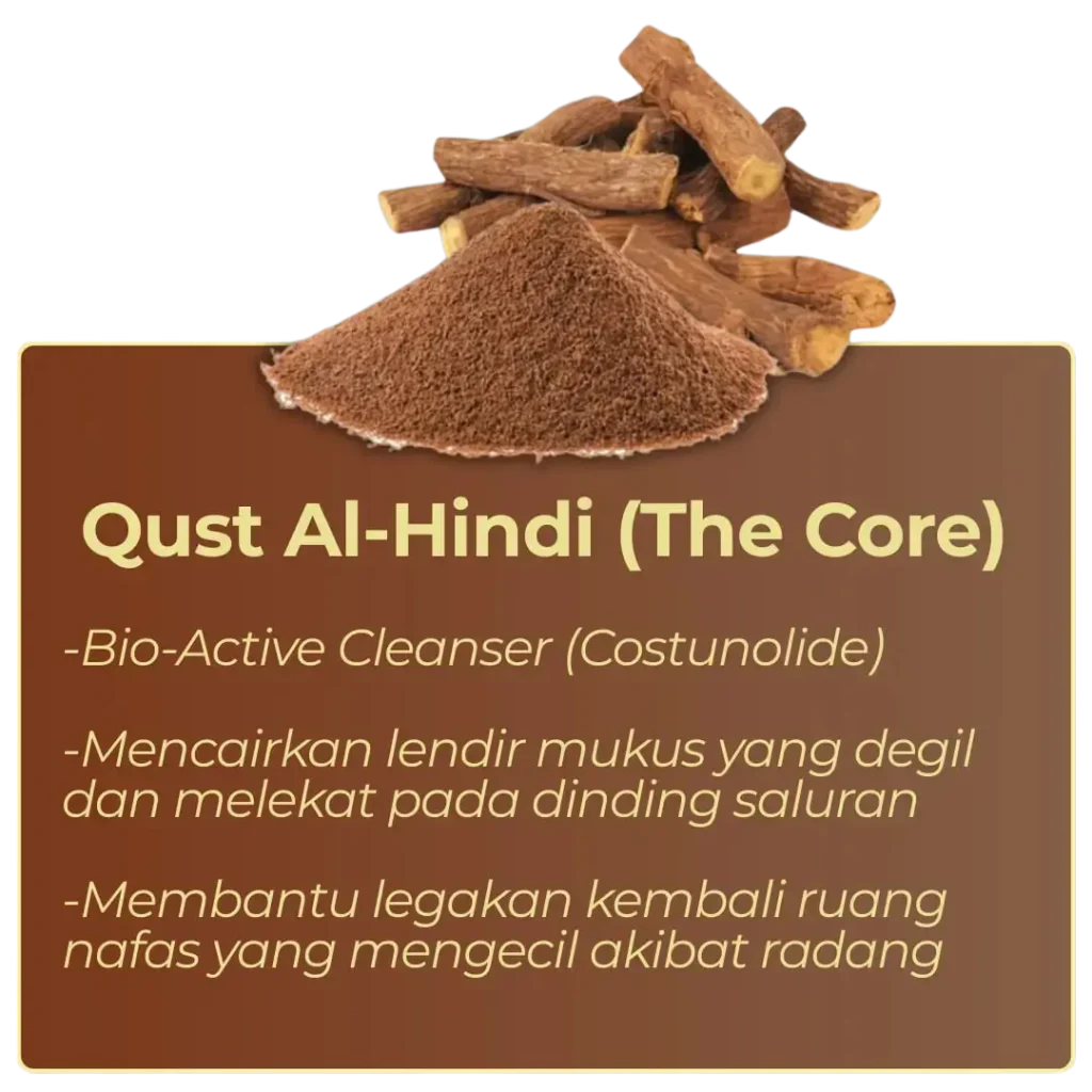 Kandungan aktif dalam Qust Al-Hindi bertindak sebagai biosolvent semulajadi yang membantu melegakan saluran tersebut, menyokong aliran oksigen yang lebih lancar.