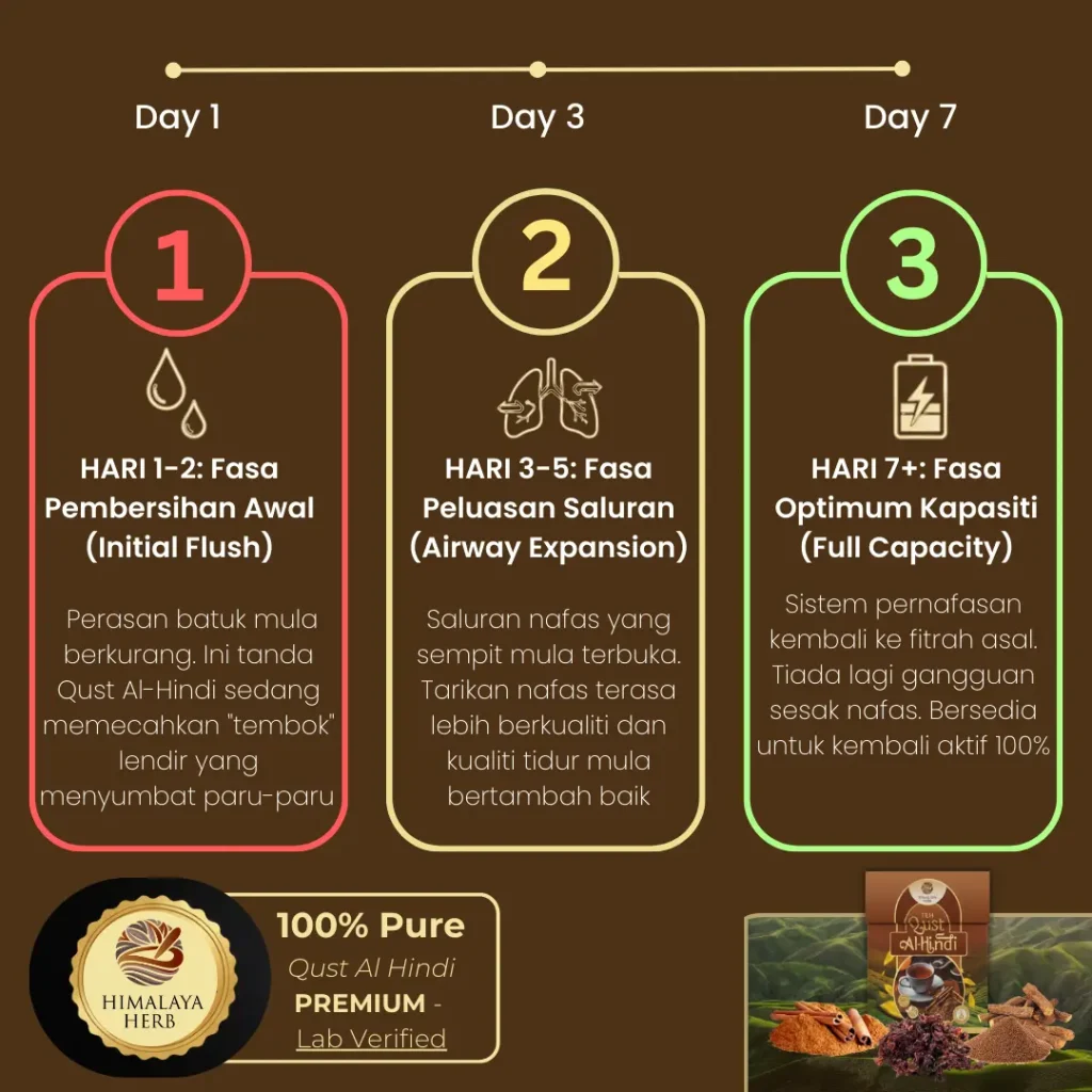 Minum 2 cawan Qust Al Hindi setiap hari. 1 cawan pagi dan 1 cawan petang. Untuk hasil terbaik, amalkan secara konsisten
